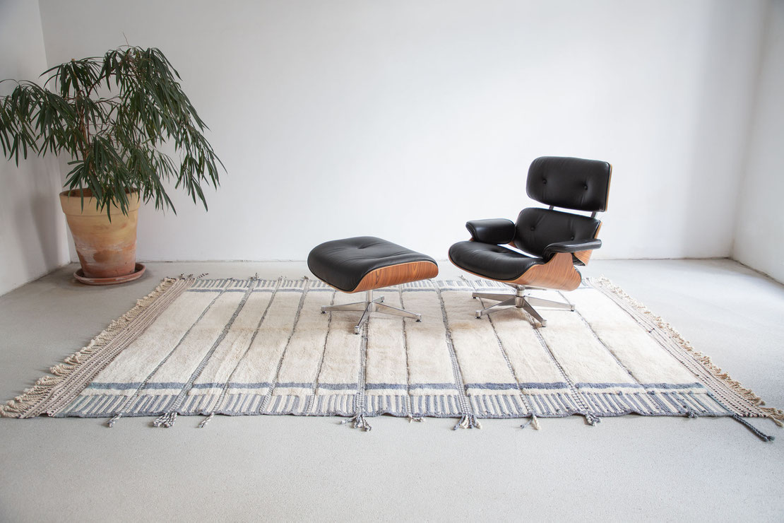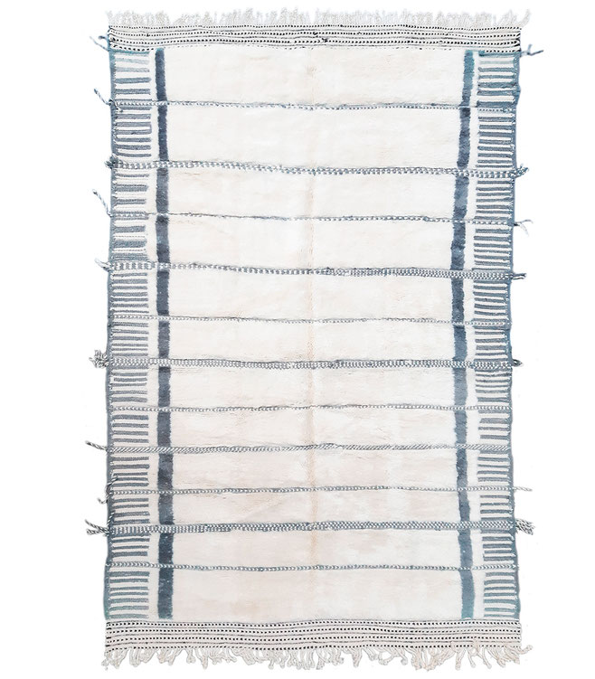 Moderner marokkanischer Wollteppich aus unserer Neuproduktionsschiene. Der Teppich wurde nach traditionellen Methoden von erfahrenen Berber-Knüpferinnen im Mittleren Atlas Gebirge handgeknüpft.